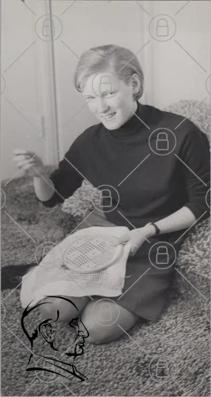 kvinna, hantverk, broderi, handarbete, svartvitt, textil, kreativitet, sy, nål, tråd, leende, inomhus, 1960-tal, handarbete, mönster, tyg, hobby, konst, tradition, detaljer, fokus, arbete, avslappnad, sittande, hand, verktyg, skapande, nostalgi, retro, stil
