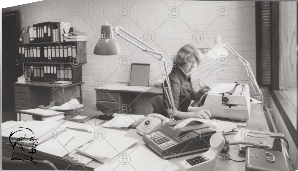 kontor, skrivmaskin, telefon, papper, dokument, lampa, skrivbord, kvinna, arkiv, kontorsmaterial, svartvitt, arbete, kontorsmiljö, skrivande, kontorsstol, pappershögar, kontorsutrustning, 1970-tal, retro, kontorslandskap