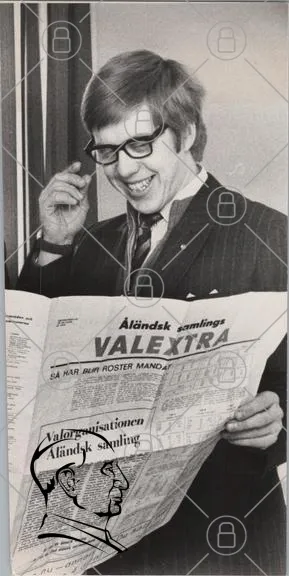 man, glasögon, tidning, skratt, svartvitt, kläder, kostym, slips, text, rubrik, Valextra, organisation, 1970-tal, retro, leende, händer, papper, information, nyheter, dokument, gammal, fotografi, ansikte, uttryck, kultur, samhälle, historia, reportage, journalistik, kommunikation