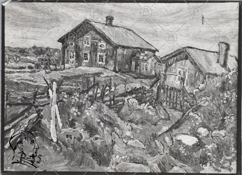 hus, landskap, svartvitt, målning, natur, staket, trädgård, gård, byggnader, sten, tak, konst, landsbygden, vegetation, gammal, traditionell, rural, konstverk, detaljer, struktur, himmel, moln, jord, grönska, skugga, perspektiv, textur, stil, komposition