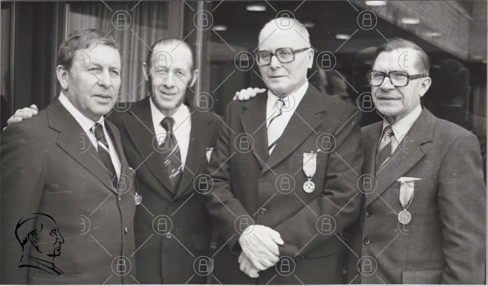 svartvitt, män, kostymer, medaljer, gruppfoto, 1970-tal, ansikten, kläder, tradition, ceremoni, leenden, hår, glasögon, stil, minnen, historia, evenemang, samarbete, vänskap, utmärkelser, fest, samling, bakgrund, inomhus, porträtt, äldre, gemenskap, firande, nostalgi, fotografi
