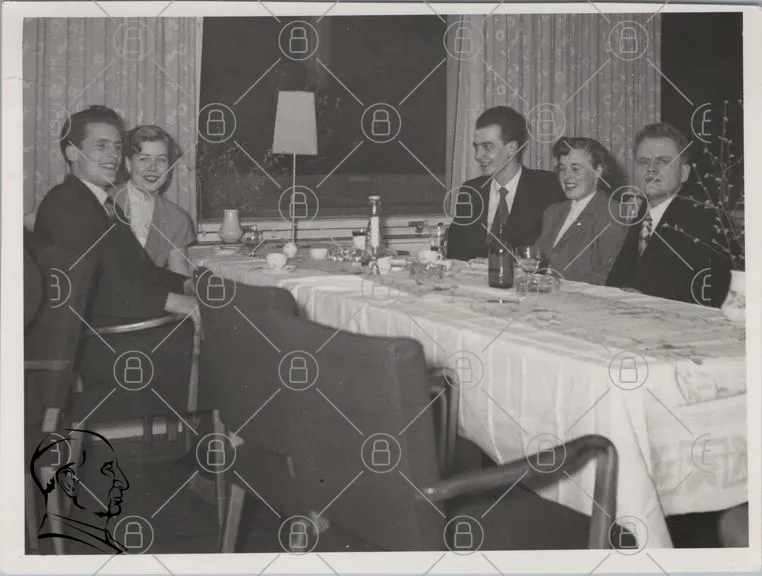 middag, sällskap, bord, stolar, lampor, glas, flaskor, duk, leenden, kläder, svartvitt, fest, vänner, samvaro, 1950-tal, inomhus, socialt, skratt, samtal, tradition, familj, eleganta, atmosfär, gemenskap, nostalgisk, interiör, tidsepok, stil, glädje, minnen