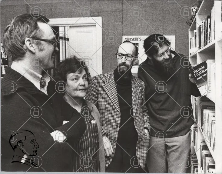 svartvitt, foto, människor, grupp, inomhus, bibliotek, böcker, samtal, 1970-tal, kläder, glasögon, skägg, kvinna, man, ansiktsuttryck, kultur, litteratur, historia, konst, kreativitet