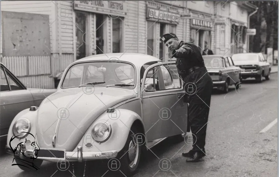 bil, polis, Volkswagen, gammal, svartvit, stad, trafik, övervakning, 1960-tal, vintage, parkering, väg, uniform, säkerhet, myndighet, klassisk, motorfordon, gatubild, historisk, retro