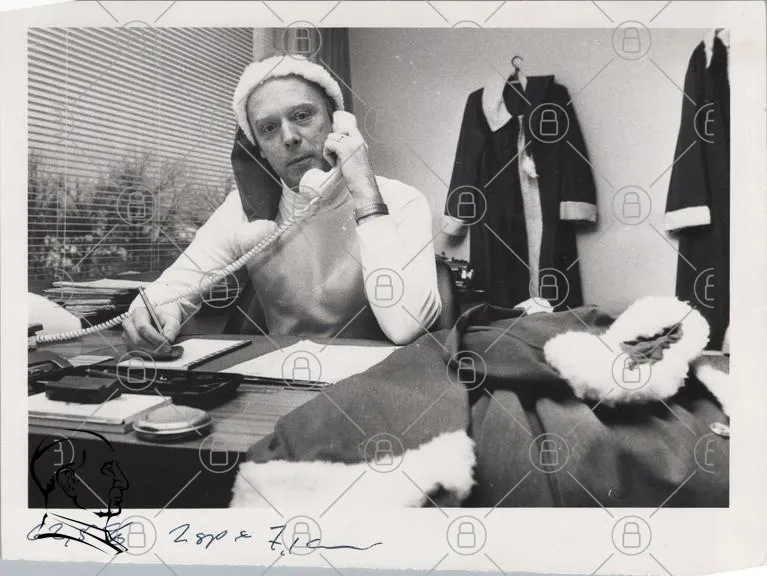 man, telefon, skrivbord, kontor, kostym, jul, vit, svartvitt, kläder, anteckningar, hatt, snö, julklappar, tradition, 1970-tal, vintage, affärsmann, professionell, arbete, kommunikation, stil, retro, inredning, dokument, penna, allvarlig, leende, bakgrund, fönster