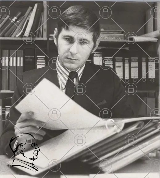 man, kontor, dokument, svartvitt, 1970-tal, kläder, pappersarbete, fokus, skrivbord, arkiv, professionell, affärsmann, analys, koncentration, stil, formell, papper, mapp, böcker, arbetsmiljö, retro, vintage, ansiktsuttryck, manlig, arbetsuppgifter, kontorsarbete, studera, läsa, information, organisation