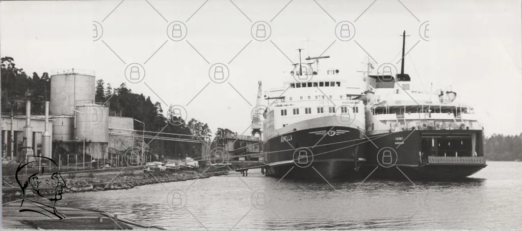 fartyg, båt, hamn, vatten, trä, bro, landskap, svartvitt, transport, sjöfart, kaj, byggnader, träd, industri, hav, segling, ankarplats, resor, passagerare, last, motor, fartygsnamn, kajplats, sjö, natur, historia, kultur, Sverige