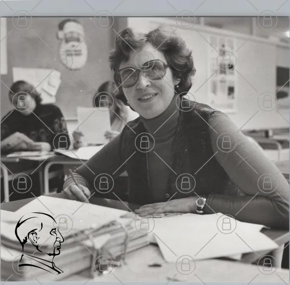 lärare, klassrum, 1970-tal, glasögon, skrivbord, böcker, papper, elever, svartvitt, utbildning, kvinna, stil, kontorsmaterial, anteckningar, skrivande, studier, pedagogik, skolmiljö, leende, professionell, retro, akademisk, undervisning, lärande, skola, ungdomar, arbetsplats, kreativitet, samarbete, fokus