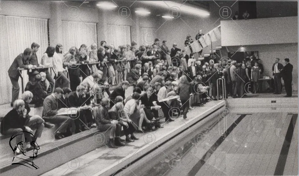 publik, simhall, åskådare, evenemang, 1970-tal, svartvit, simning, bänkar, människor, sport, tävling, ungdomar, kläder, socialt, samling, vatten, stämning, koncentration, observation, aktivitet