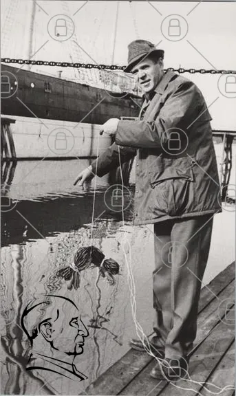man, vatten, båt, fiske, snöre, nät, kaj, svartvitt, kläder, hav, fiskeutrustning, aktivitet, strand, reflektion, 1960-tal, industri, hamn, fiskeplats, föremål, hantverk, tradition, natur, miljö, teknik, historia, människa, arbete, hobby, sport, kultur