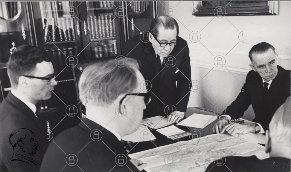 möte, dokument, skrivbord, män, glasögon, papper, planering, diskussion, svartvitt, kontor, böcker, kartor, anteckningar, affärsmän, 1900-tal, formella kläder, samarbete, strategi, beslut, historia