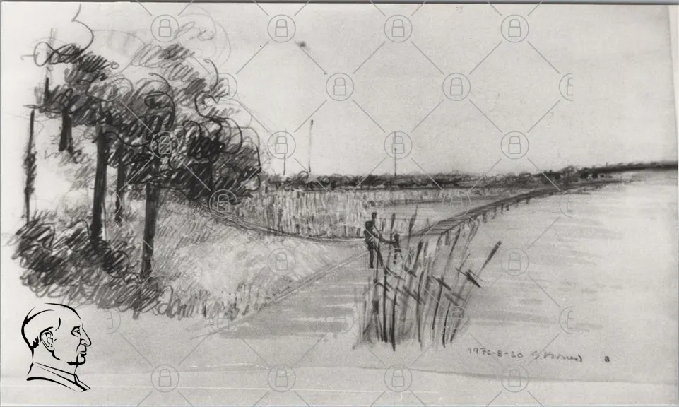 landskap, teckning, träd, vatten, väg, gräs, person, horisont, natur, skugga, linjer, svartvitt, konst, 1978-08-20, stillhet, reflektion, perspektiv, detaljer, struktur
