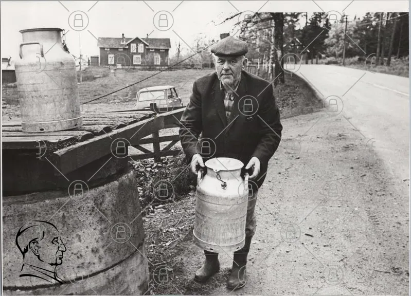 man, mjölk, mjölkkruka, landsbygd, svartvitt, gammal, hus, väg, träd, lantbruk, tradition, 1950-tal, landskap, gård, mjölkproduktion, kläder, hatt, metall, behållare, historia, rural, natur, fordon, gammal bil, gårdsarbete, kultur, nostalgi