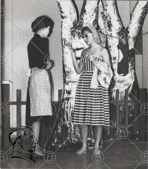 svartvit, kvinnor, mode, kläder, 1950-tal, solglasögon, randig klänning, förkläde, bakgrund, träd, inomhus, stil, vintage, samtal, accessoarer, frisyr, ängelholm, retro, fotografi, kultur, utställning, konst, socialt, interaktion, tidsepok, kläddesign, estetik, uttryck, kroppsspråk, miljö
