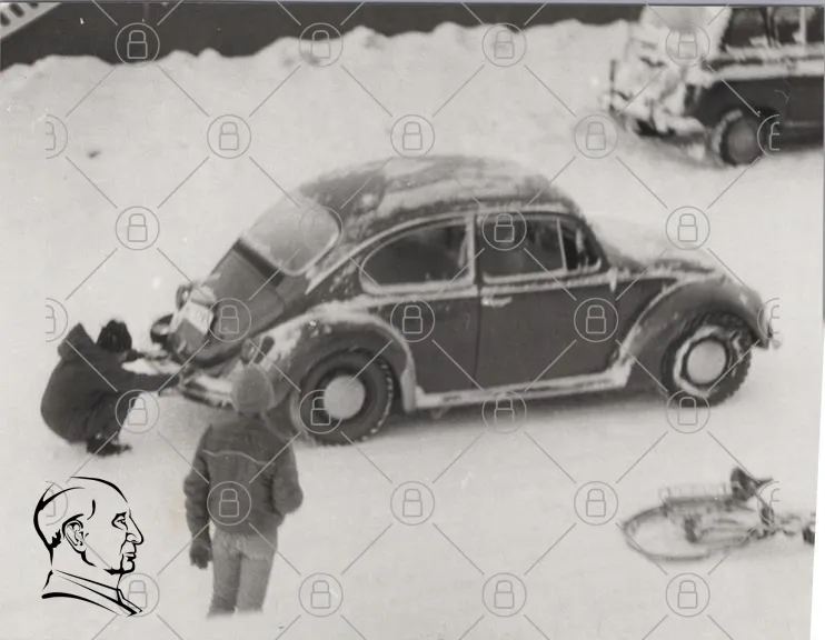 snö, bil, Volkswagen, barn, vinter, dragning, lek, gammal, svartvitt, kläder, snödrivor, väg, motorfordon, familj, utomhus, vinterkläder, hjul, däck, is, snöfall
