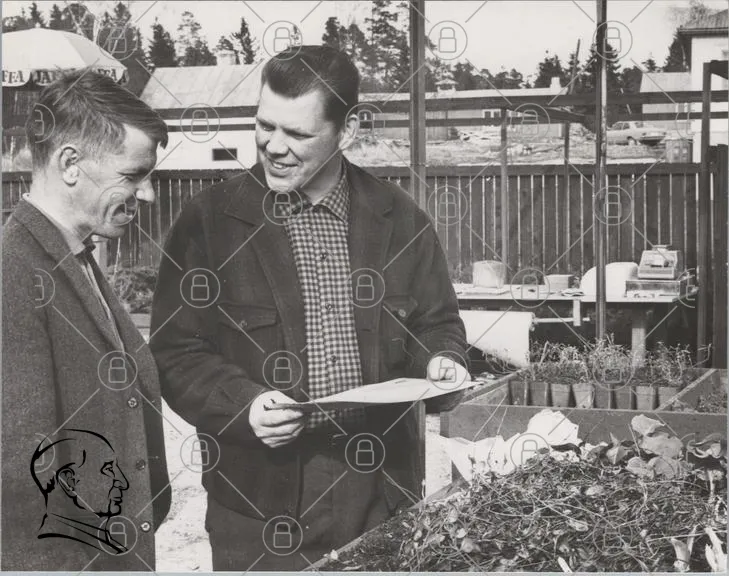 två män, samtal, papper, trädgård, växter, svartvitt, utomhus, kläder, 1960-tal, byggnader, natur, vänskap, diskussion, jord, trädgårdsarbete, verktyg, landskap, bakgrund, grönska, projekt, forskning, odling, tradition, historia, samarbete, leende, intresse, information, dokument, plantering
