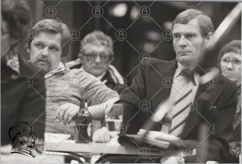 möte, män, kostym, glasögon, bord, dryck, flaska, anteckningar, diskussion, interiör, konferens, svartvitt, grupp, koncentration, formellt