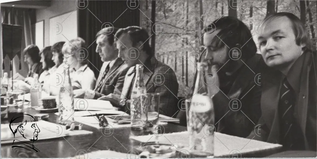 möte, panel, diskussion, män, 1970-tal, svartvitt, bord, glas, dokument, kläder, kostymer, konferens, presentation, allvarliga, uttryck, inomhus, bakgrund, vägg, trä, skrivbord, anteckningar, mikrofon, publik, professionell, samarbete, företag, samhälle, historia, kultur, kommunikation