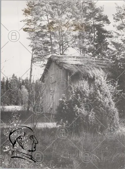 stuga, skog, träd, gräs, tak, dörr, buskar, natur, svartvit, landskap, gammal, byggnad, sommar, svensk, rural, stillhet, utomhus, fotomotiv, traditionell, enslig