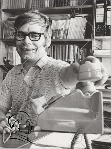 man, glasögon, leende, kontor, skrivmaskin, retro, svartvitt, 1970-tal, kläder, inredning, böcker, arbetsplats, teknik, nostalgi, fotografi, kreativitet, arbete, stil, personlig, uttryck, hobby, professionell, vintage, design, kontorsutrustning, mänsklig, interiör, kultur, historia, kommunikation