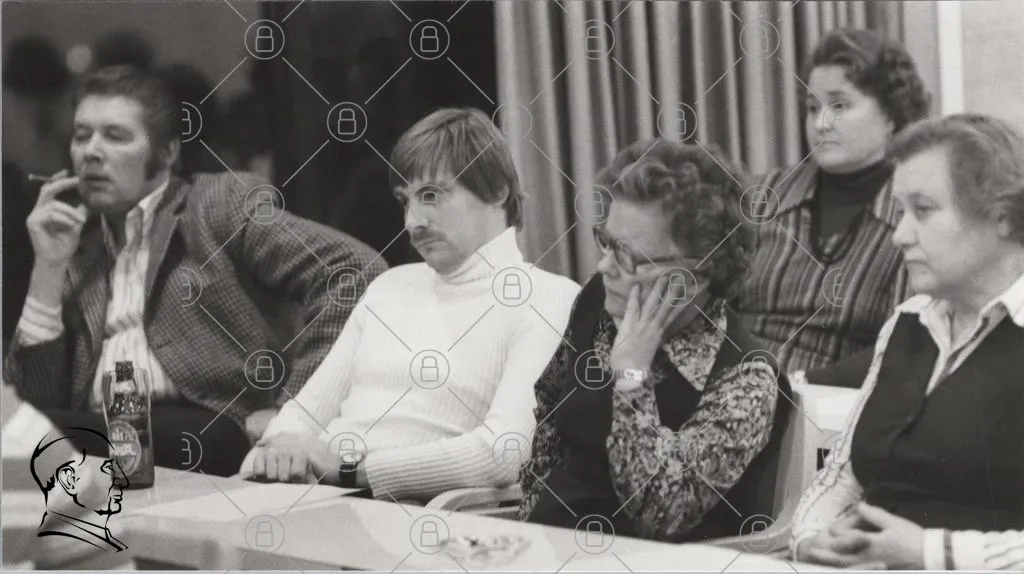 möte, personer, svartvitt, man, kvinna, tröja, glasögon, bord, gardiner, diskussion, koncentration, interiör, grupp, sittande, konferens, 1970-tal, retro, formellt, kläder, ansiktsuttryck