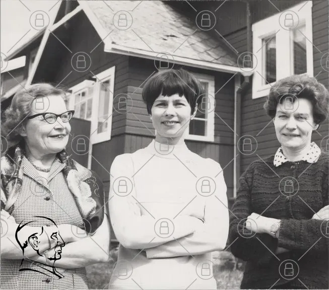 kvinnor, svartvitt, foto, leende, hus, 1960-tal, mode, glasögon, armkors, vänskap, porträtt, traditionell, kläder, utomhus, samarbete, generationer, nostalgi, familj, gemenskap, bakgrund