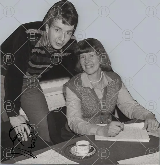 man, kvinna, svartvitt, foto, leende, skrivbord, papper, anteckningar, kopp, kläder, 1980-tal, inomhus, interiör, frisyr, ansiktsuttryck, samarbete, dokument, kontor, vänskap, professionell, avslappnad, samtal, arbete, team, kreativitet, minnen, nostalgi, uttryck, gemenskap