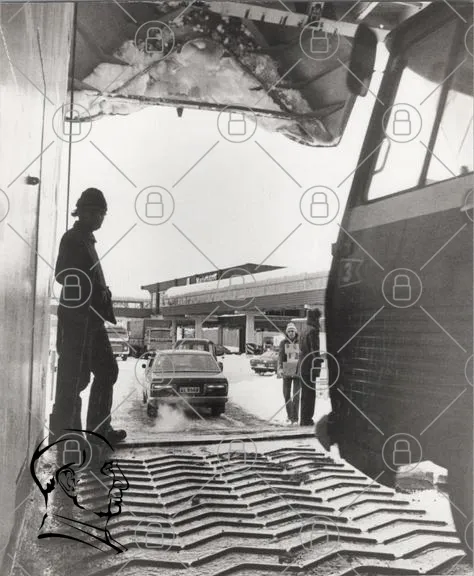 snö, vinter, lastbil, väg, trafik, människa, bil, byggnad, port, stad, svartvitt, utomhus, fotgängare, lastning, transport, landskap, 1970-tal, gammal, retro, industri, snöfall, kläder, stående, gående, vägskylt, lastbilschaufför, motorväg, snödrivor, asfalt, foton