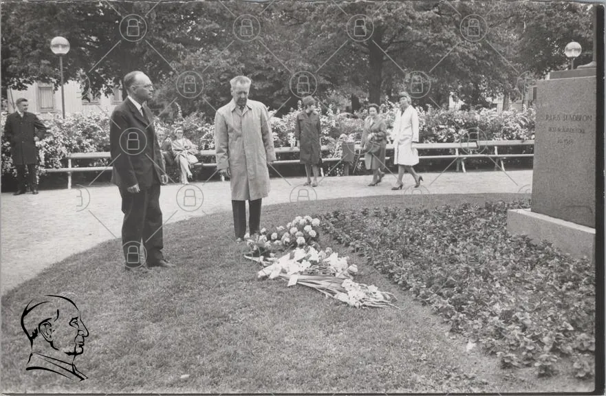 blommor, park, människor, minnesceremoni, svartvitt, kläder, träd, bänkar, blomsterarrangemang, tradition, sorg, samling, utomhus, 1900-tal, statyer, blommor på marken, högtidlighet, respekt, historisk, samhörighet, familj, vänner, ceremonin, blommor i rad, grav, hyllning