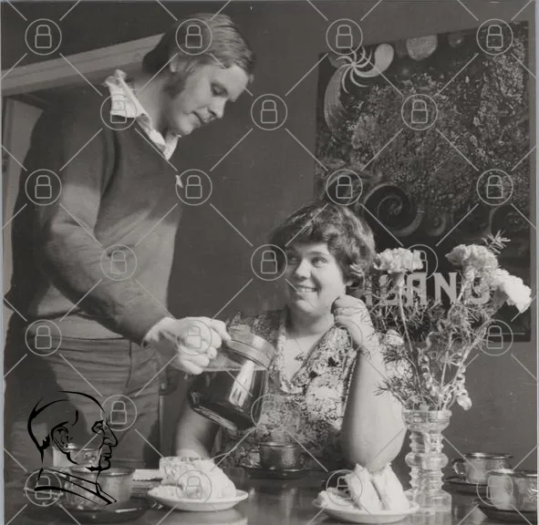 kaffe, servera, kvinna, man, bord, blommor, retro, svartvitt, 1970-tal, leende, fika, porslin, mat, hem, inredning, familj, tradition, samvaro, fest, dukning