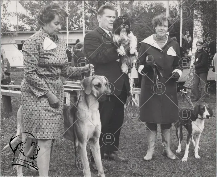 hundar, hundutställning, människor, svartvitt, kläder, 1960-tal, stora hundar, små hundar, kvinnor, män, hundraser, utställningsring, djur, sällskapsdjur, fotografering, socialt, evenemang, tradition, tävling, hundägare, hundskötsel