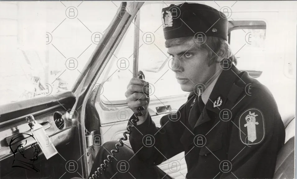 polis, uniform, radio, bil, svartvitt, man, ungdom, kommunikation, säkerhet, myndighet, 1970-tal, professionell, tjänst, kontroll, övervakning, interiör, retro, nostalgi, bild, fotografi