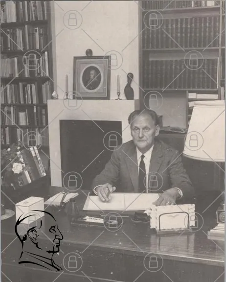 man, skrivbord, böcker, bibliotek, porträtt, blommor, kontor, dokument, glasögon, lampor, vintage, svartvitt, inredning, papper, penna, skrivande, möbler, akademisk, professionell, stil, 1900-tal, intellektuell, studier, forskning, historia, kultur, tradition, fokus, eftertänksam