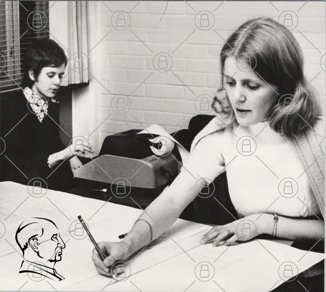 kvinnor, skrivmaskin, kontor, 1970-tal, svartvitt, arbete, papper, anteckningar, penna, skrivbord, kläder, inredning, fokus, samarbete, kreativitet, dokument, retro, stil, professionellt, miljö