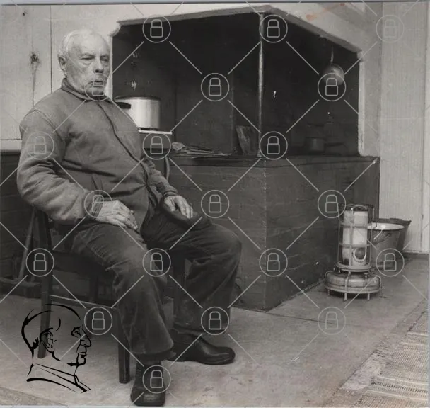 gammal man, sittande, kök, stolar, belysning, vedspis, svartvitt, inomhus, kläder, ansiktsuttryck, hem, traditionell, gammaldags, möbler, rum, interiör, lampor, golv, textil, skugga, stillhet, nostalgi, livsstil, kultur, historia, person, ensamhet, värme, atmosfär, tidlös