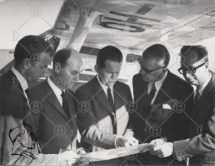 flygplan, män, kostymer, möte, dokument, svartvitt, historia, affärsmän, diskussion, 1960-tal, fotografi, utomhus, samarbete, teknik, planering, ledarskap, representation, formell, grupp, avtal