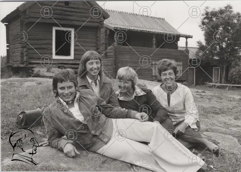 kvinnor, grupp, svartvitt, foto, leende, utomhus, kläder, 1970-tal, byggnad, natur, vänskap, porträtt, avslappnad, stil, traditionell, landsbygd, gemenskap, skratt, minnen, nostalgisk
