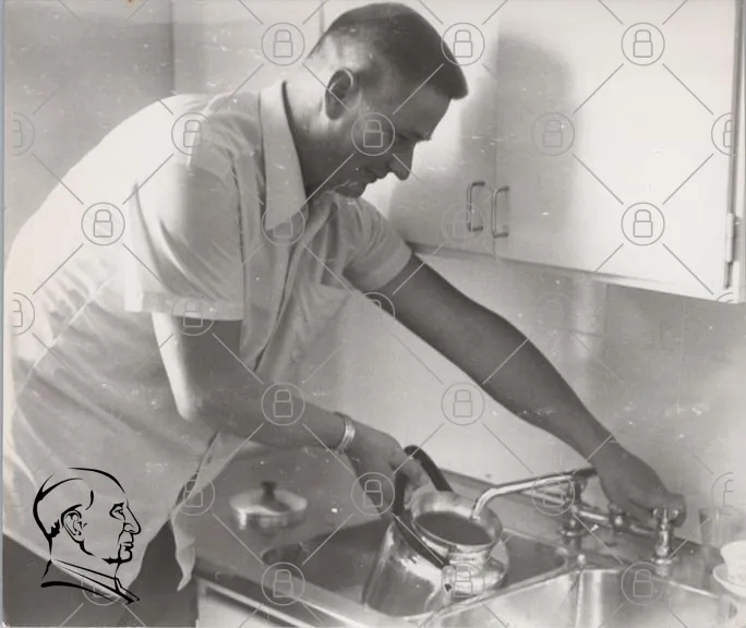 man, kök, vatten, kanna, diskho, svartvitt, 1950-tal, hushåll, matlagning, retro, inredning, leende, hushållsarbete, köksutrustning, metallkanna, handfat, vardag, hemliv, familjeliv, tradition, nostalgi, människa, aktivitet, heminredning, köksmiljö, vintage, stil, ätande, dryck