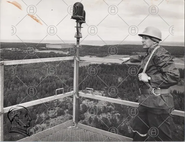 man, utsikt, torn, skog, natur, säkerhet, kläder, arbete, 1950-tal, svartvit, landskap, övervakning, höjd, utrustning, miljö, friluftsliv, fotografering, tradition, historia, teknik, avstånd, stillhet, fokus, professionell, byggnad, plattform, kommunikation, signal, observation, ranger