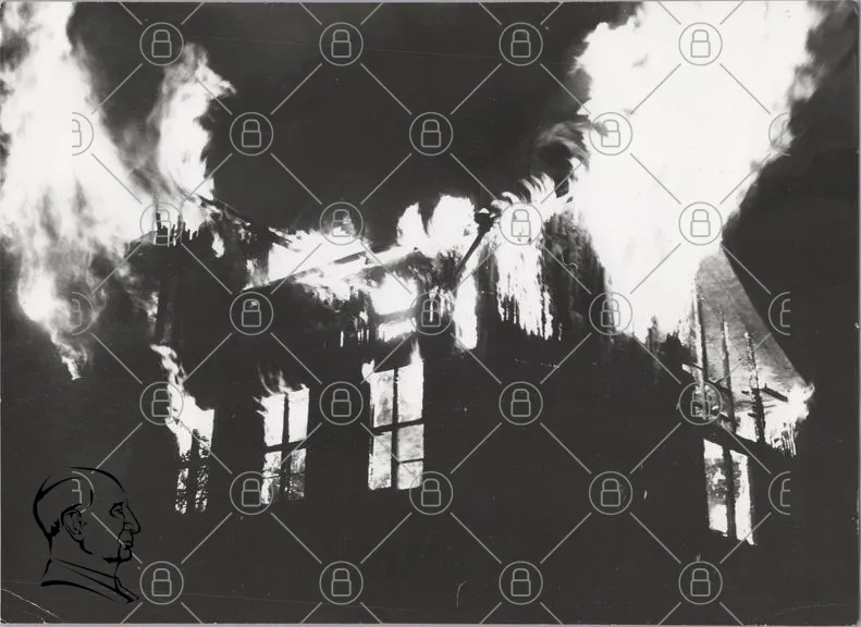 eld, brand, byggnad, fönster, rök, flammor, natt, förstörelse, katastrof, svartvitt, ljus, skugga, tak, trä, säkerhet, fara, räddning, brandmän, ruiner, hetta, osäkerhet