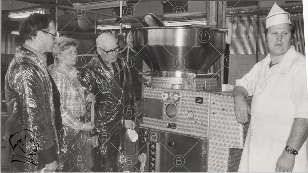 industri, maskin, människor, besök, teknik, säkerhetskläder, metall, utrustning, forskning, laboratoriemiljö, svartvitt, observation, experiment, innovation, 1900-tal, utbildning, presentation, vetenskap, process, produktion