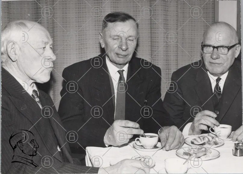 tre män, bord, kaffe, te, samtal, svartvitt, kläder, slipsar, tallrikar, koppar, inomhus, möte, 1900-tal, ansiktsuttryck, diskussion, traditionell, socialt, samvaro, äldre, stil, interiör, bakgrund, duk, sällskap, uttryck, gest, fokus, vänskap, historia