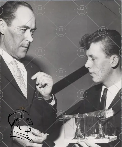man, pojke, trofé, svartvitt, kläder, kostym, skjorta, pris, uttryck, interaktion, 1960-tal, vintage, fotografi, ansikten, gest, sport, prestation, ungdom, vuxen, ceremoni, minne, historia, tradition, stil, framgång, glädje, beundran, fokus, presentation, evenemang