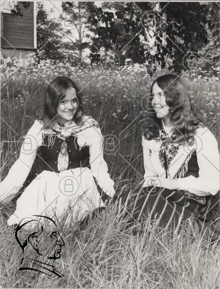 två kvinnor, kläder, traditionella, skrattande, gräs, blommor, svartvitt, porträtt, natur, vänskap, 1970-tal, folkloristiska, leende, ungdomar, utomhus, kultur, klänningar, scarf, fotografering, avslappnad, sommar, landskap, vintage, stil, gemenskap, glädje, tradition, bakgrund, naturligt