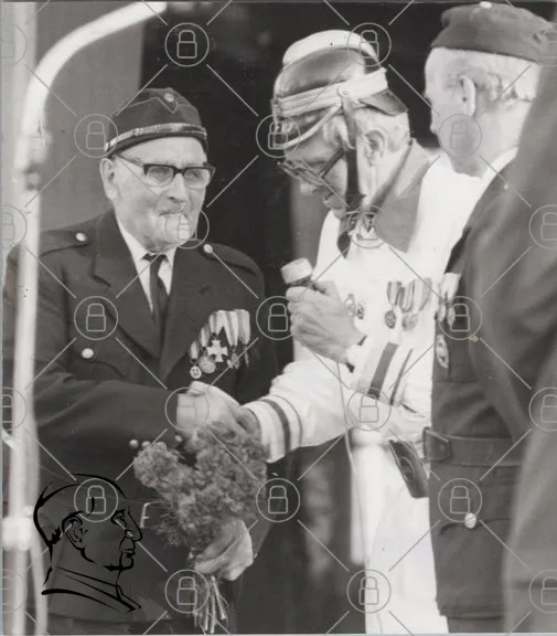 ceremoni, medaljer, veteran, blommor, uniform, äldre man, tal, hyllning, historisk, minnesstund, fest, tradition, ära, respekt, samling, publik, ledare, evenemang, kläder, svartvitt, 1900-tal, minnen, gemenskap, hedersbetygelse, militär, samhälle, kultur, festlighet, uppvaktning, känslor, nostalgi