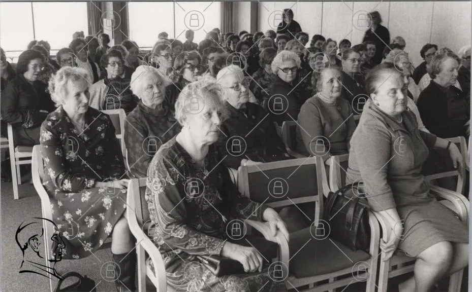 publik, föreläsning, äldre, kvinnor, män, samling, åhörare, konferens, kläder, sittande, svartvitt, evenemang, gemenskap, diskussion, intresse, ålder, ansikten, uttryck, lokal, bänk, stolar, samarbete, information, lärande, socialt, kultur, historia, minnen, tradition, samhälle, engagemang