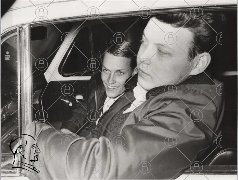 bil, svartvitt, män, ungdomar, leende, interiör, 1960-tal, retro, vänner, fotografi, nostalgi, klassisk, sittande, ansikten, stil, mode, uttryck, ögon, kläder, detaljer, minnen, historia, transport, fordon, samhörighet, ungdomlighet, avslappnad, casual, bilar, miljö