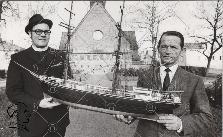 båt, modell, män, kyrka, segelbåt, historia, fotografi, svartvitt, 1960-tal, tradition, hantverk, sjöfart, kultur, skala, trä, detaljer, kostymer, leende, samarbete, utställning, presentation, handarbete, nostalgi, gemenskap, landskap, byggnad, mänsklig, föremål, konst