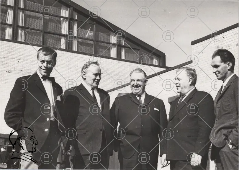 svartvitt, män, kostymer, slipsar, byggnad, 1960-tal, gruppfoto, leende, formella kläder, arkitektur, utomhus, affärsmän, traditionell, stil, samarbete, historisk, professionell, evenemang, socialt, interaktion