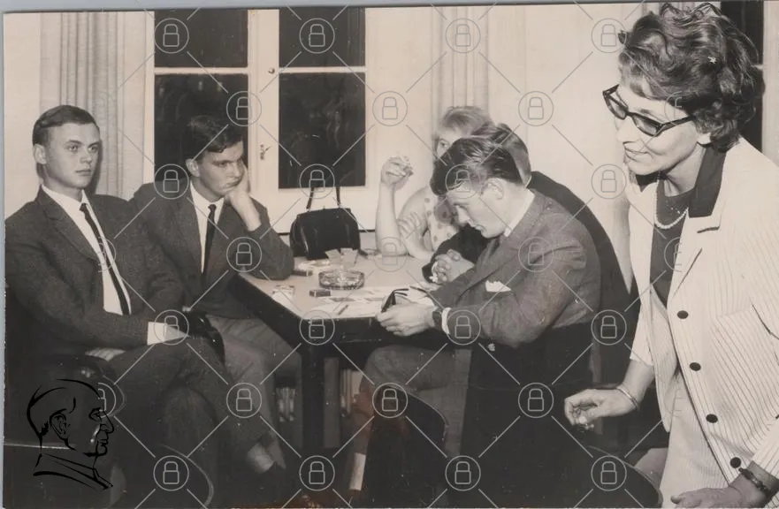 möte, 1960-tal, kläder, bord, människor, diskussion, glas, aska, inomhus, svartvitt, ungdomar, stil, ansiktsuttryck, interaktion, socialt, samtal, sittande, kavaj, skjorta, byxor, kvinna, man, fokus, observation, grupp, uttryck, tidsepok, retro, nostalgi, fotografi